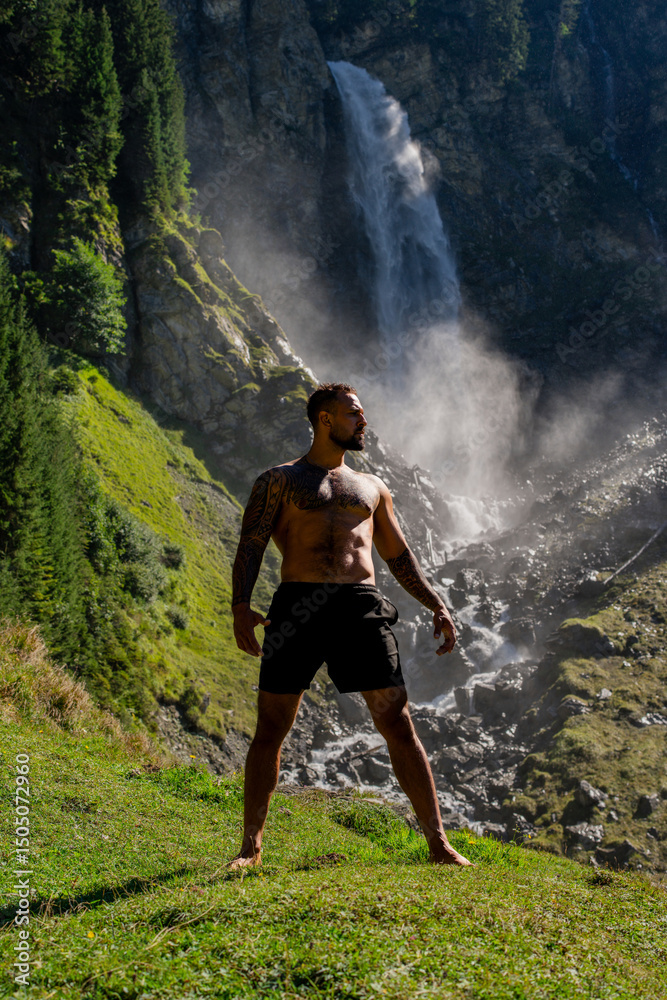 Freedom on nature. Handsome man with naked torso on summer vacation. Sexy hiker outside. Carefree and freedom. Tourist man walking on the waterfall landscape. Free Man Traveling and nature.