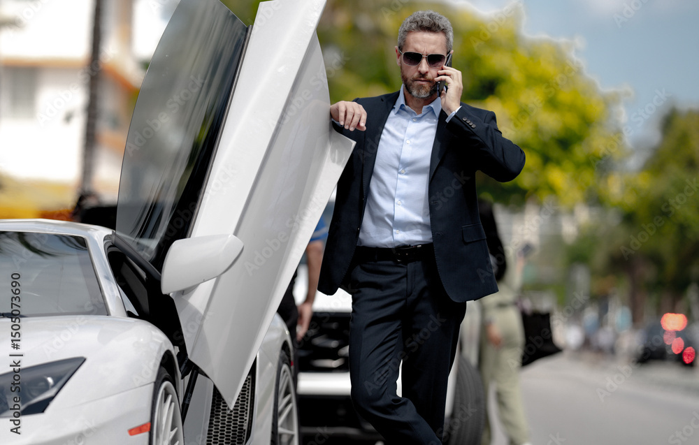 Mature businessman. Rich business man enjoying success. Luxury business. Rich man front of expensive car. Luxury business travel. Confident rich businessman in a classic suit.