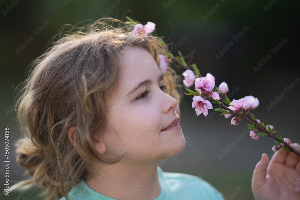 Spring kid portrait. Blonde kid in a blooming meadow. Childhood joy in nature. Kid with flowers on spring day. Smiling kid playing outdoors in spring nature. Dreamy spring kids face.