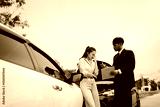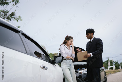 Man and woman standing by damaged car after accident, examining vehicle and filing insurance claim with agent for roadside assistance and repair.