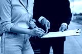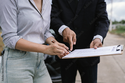 Man and woman standing by damaged car after accident, examining vehicle and filing insurance claim with agent for roadside assistance and repair.