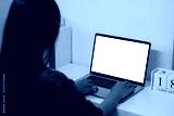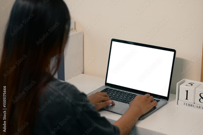 Rear view of woman working on a laptop with a blank screen at a minimalist home desk