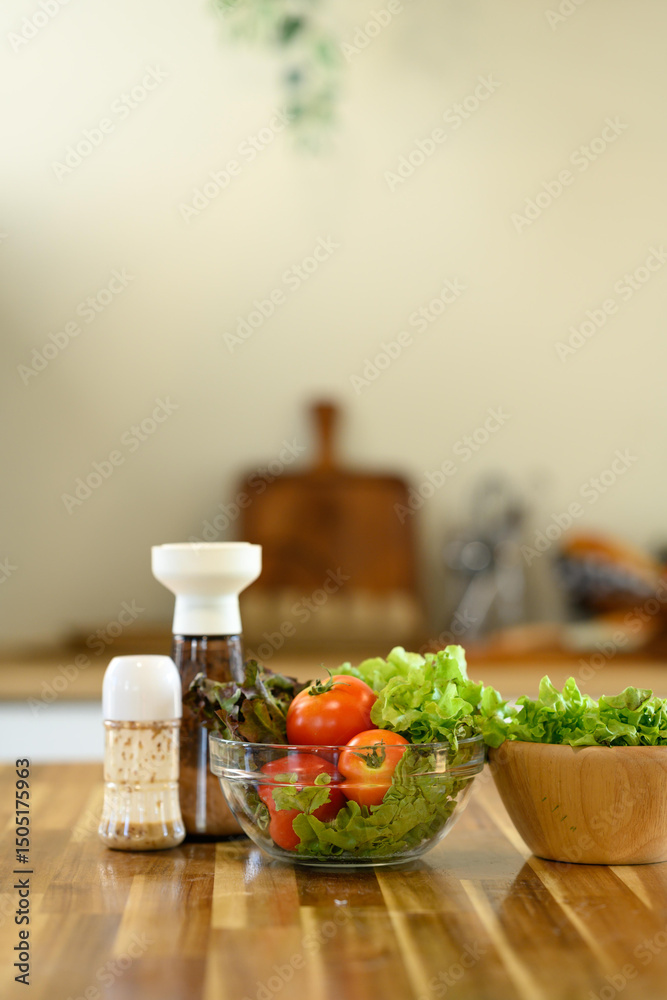 Fresh vegetables on kitchen counter, including lettuce and tomatoes in glass and wooden bowls