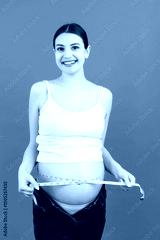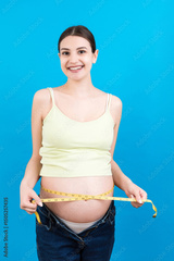 pregnant woman using tape measure to check baby development and the growth of belly. Inch measurement