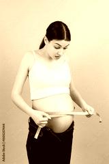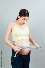 Cropped image of expecting mother in unzipped jeans measuring her pregnant belly with a tape measure at colorful background. Centimeter measurement