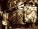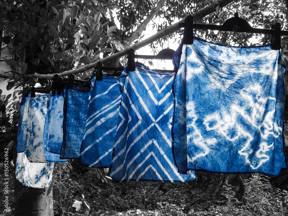 Beautiful natural indigo tie dye fabric with black and white background.