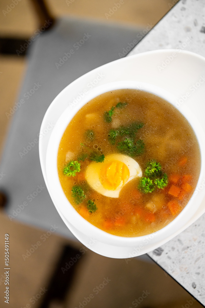 A bowl of clear soup with a halved boiled egg, diced carrots, and parsley garnish, served on a white plate on a table. Top view, minimalistic composition, healthy homemade meal.