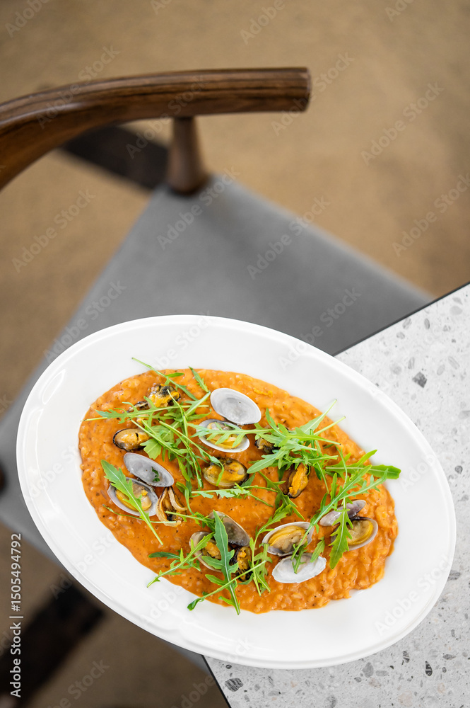 A plate of creamy tomato risotto with clams, mussels, and fresh arugula, served on a white dish. The meal is placed on a speckled countertop with a wooden chair in the background.