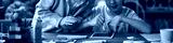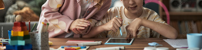 Header with children engaging in craft activities with colorful materials while using tablet for creativity, focus on hands and materials surrounding them