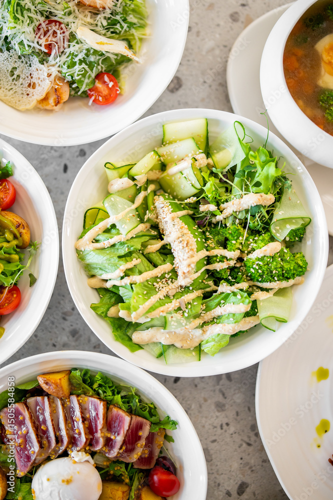 Fresh salads and dishes on a table, including Caesar salad with cherry tomatoes, cucumber salad with sesame seeds, seared tuna with poached egg, and a bowl of soup, presented appetizing composition