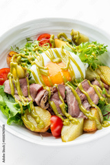 A gourmet salad with sliced beef, roasted potatoes, cherry tomatoes, mixed greens, and a poached egg, drizzled with green dressing, served in a white bowl on a dark background