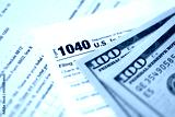 Hundred dollar bills and 1040 individual income tax return form blank close up