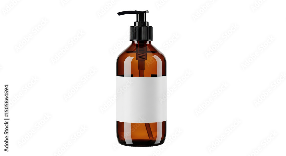 Isolated Amber Glass Bottle with Pump Dispenser and Blank White Label