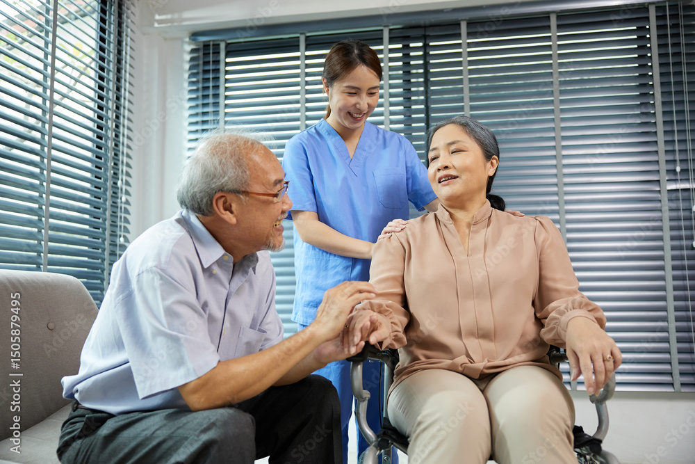nurse or caregiver helping senior woman sitting on wheelchair and senior man support her at home