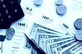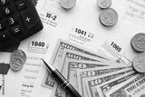 American US dollars money bills and coins with pen and calculator on IRS tax form blanks