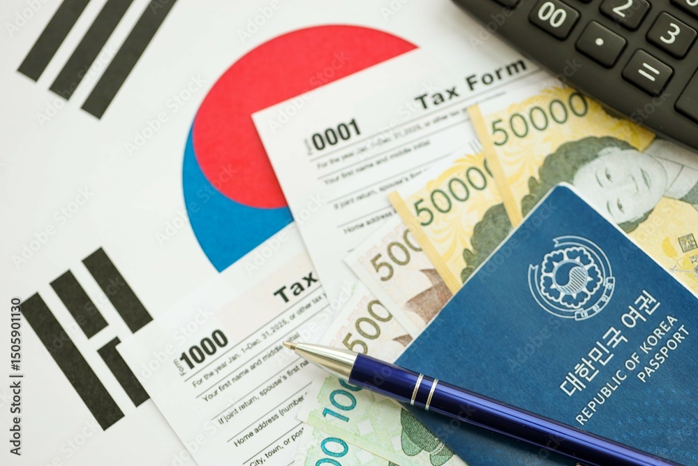 South Korean won money bills lies on table with pen, calculator, passport and tax forms