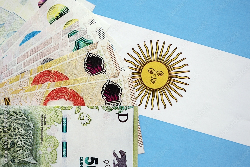 Argentine pesos money bills in big amount lies on Argentina flag close up