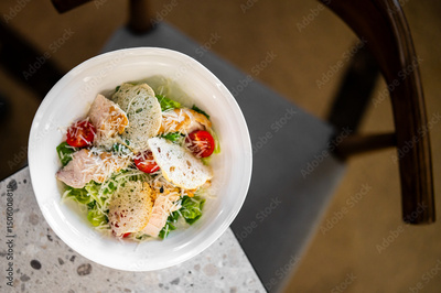Fresh Caesar salad with grilled chicken, romaine lettuce, cherry tomatoes, shredded cheese, and croutons in a white bowl on a terrazzo table. Warm dining atmosphere with wooden chair in the background
