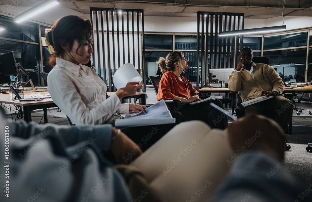 A group of diverse coworkers is actively collaborating in a modern office setting. They are seated in a casual circle, exchanging ideas and documents during a meeting or brainstorming session.