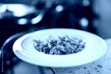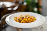Close-up of a white plate with pasta topped with delicate bonito flakes, set on a speckled countertop. Blurred background with chairs and greenery creates a cozy dining atmosphere