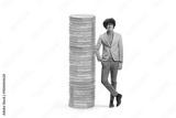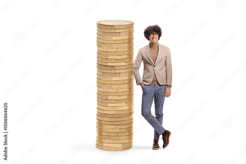 Tall young man leaning on a pile of coins and smiling