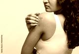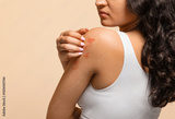 Unhappy young woman scratching her irritated skin on arm, annoyed indian female wearing white top suffering eczema or dermatitis, having itching rash on body, standing on beige studio background