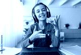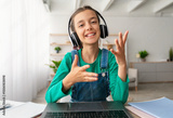 Portrait of excited teen schoolgirl distance learning during virtual remote class, participating in group online lesson on video conference call with teacher, studying at home by videocall, webcam pov