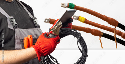 Electrician holding a tablet, cable, and clamp near high-voltage power lines, wearing gloves and work uniform. - Electrical engineering.