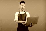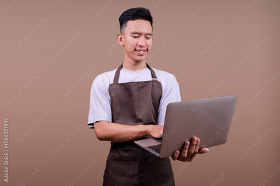 Smiling Young Asian Man In Brown Apron Using Laptop For Working Online Isolated On Beige Background