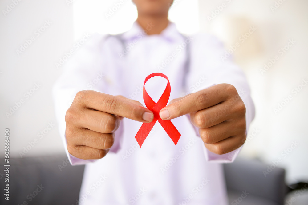 Aids Red Ribbon in Doctor's Hand for World aids day and National HIV/AIDS Awareness Month Concept
