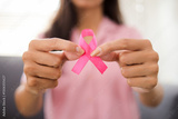 Breast Cancer. Girl in Pink T-Shirt With Cancer Awareness Ribbon.