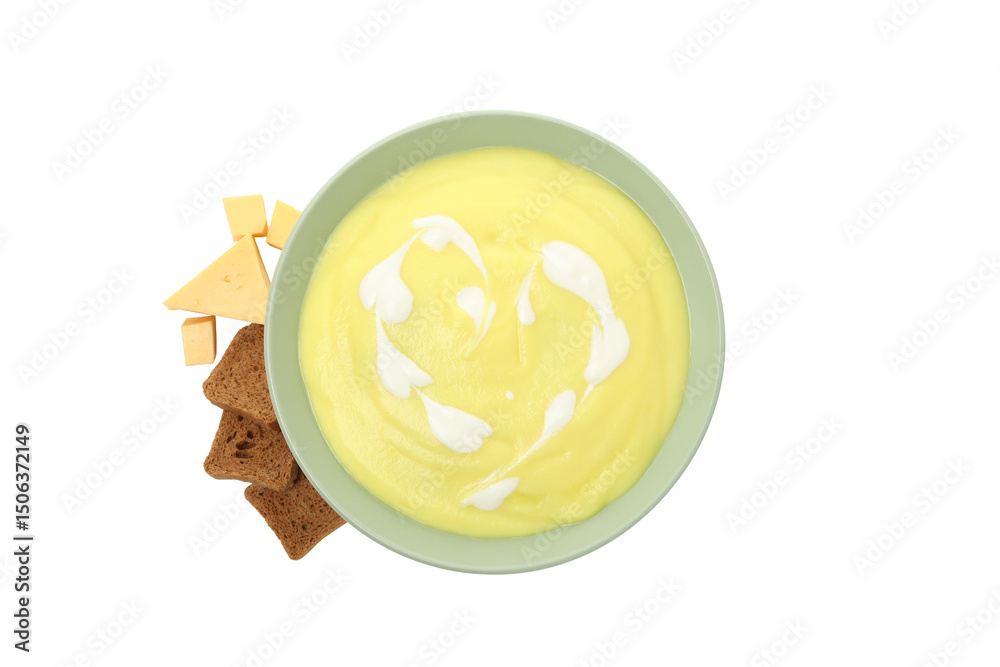 PNG,Cheese soup in a bowl with croutons, isolated on white background