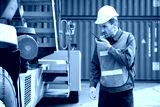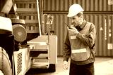 Worker or Engineer using walkie talkie and checking loaded container handler at containers warehouse storage