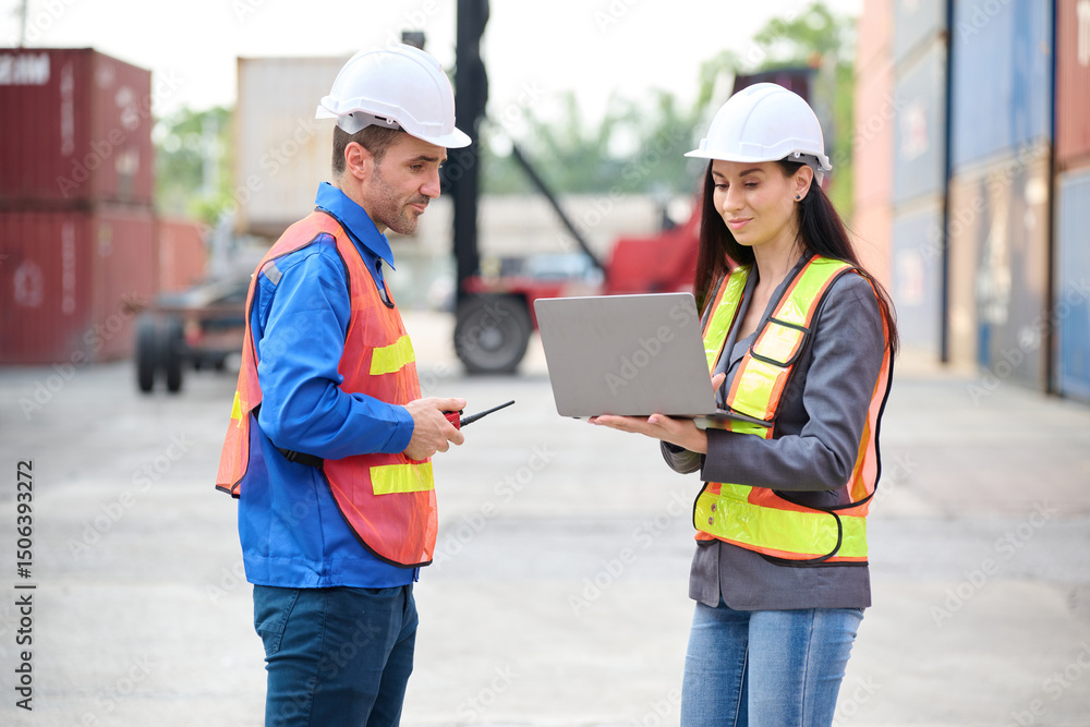 Engineers or workers using laptop computer and talking about work in containers warehouse storage