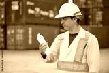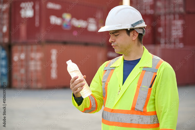 Engineer or worker drinking water and taking a break in container warehouse storage