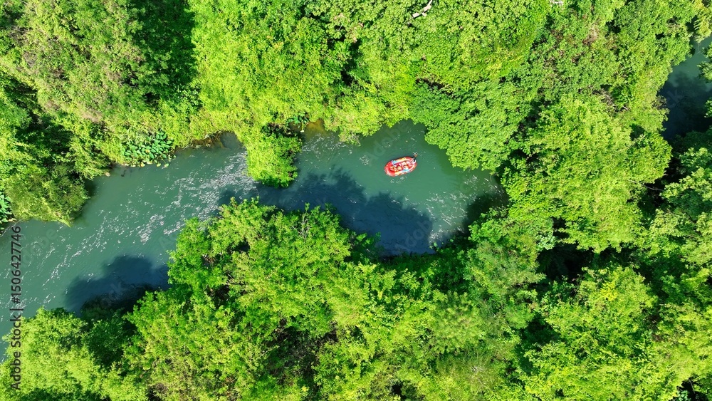 The aerial view captures the river as it weaves through the dense rainforest, with the raft drifting serenely, showcasing the peaceful coexistence of human activity and nature in a tropical paradise.