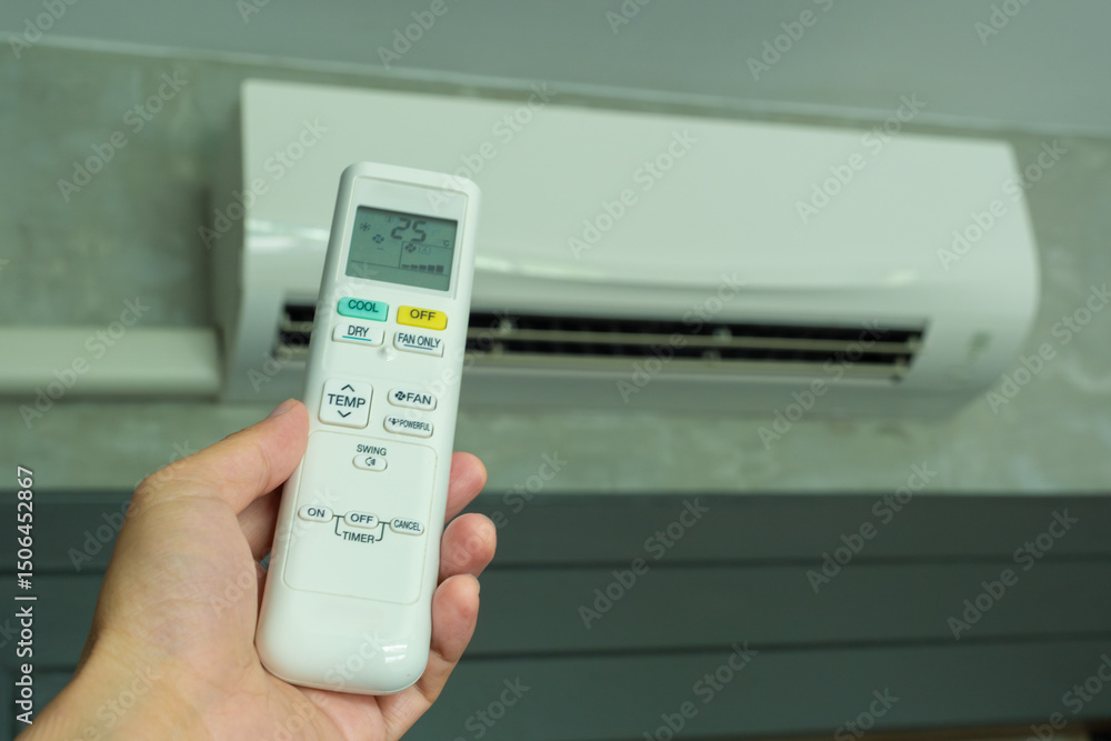 Man's hand using remote control open The air conditioner is cooled to 25 degrees Celsius in his bedroom. Health concepts and energy savings