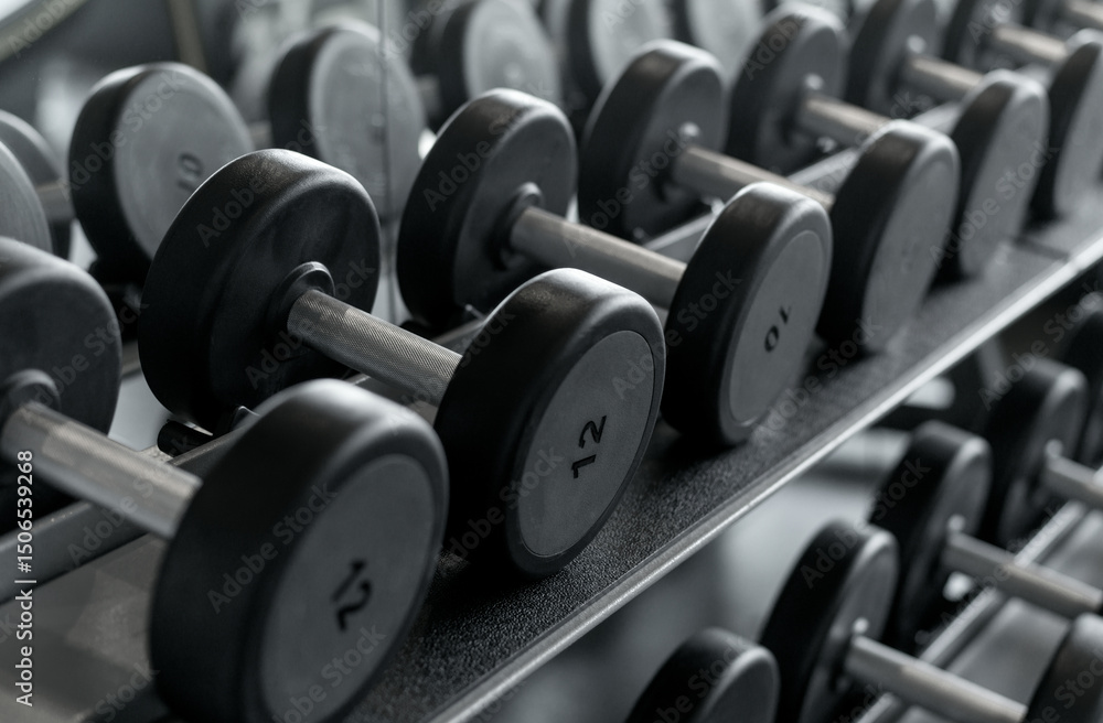 Fitness gym, closeup of dumbbells weights, Dumbbells in gym background