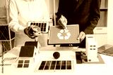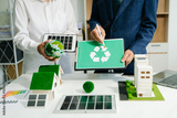 Sustainable architects presenting green building models, solar panels, and recycling symbols. Future clean energy and smart city