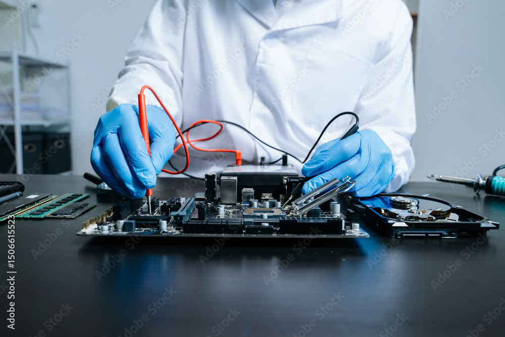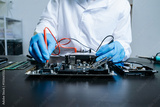Electronics technician, electronic engineering electronic repair, electronics measuring and testing, repair and maintenance concepts.uses a voltage meter to check