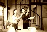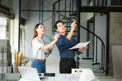 Asian man and woman architects collaborating with laptop and tablet while pointing at building structure on interior construction site.
