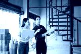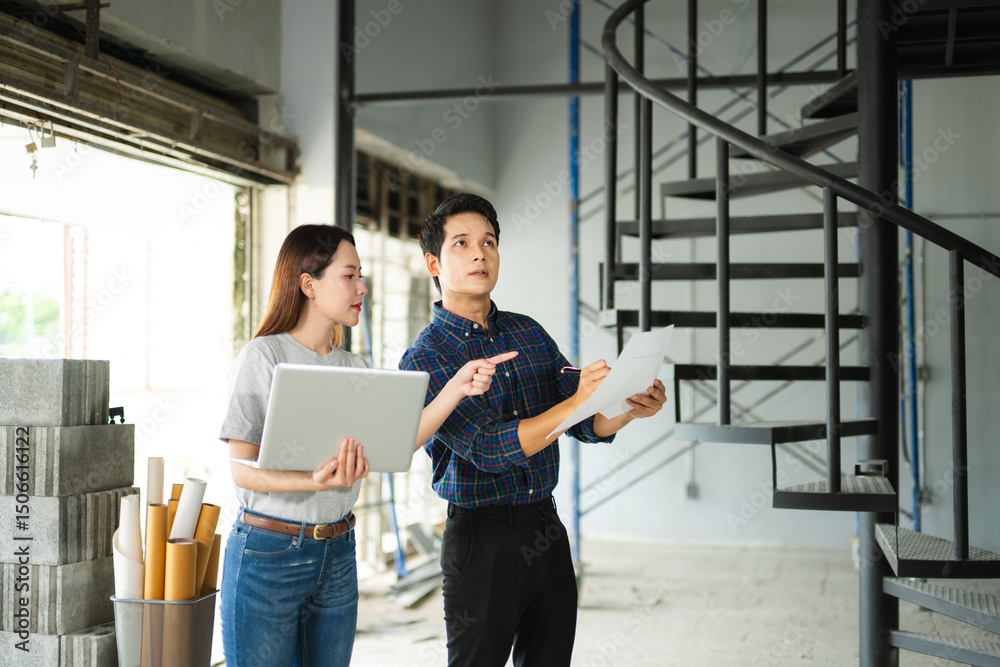 Asian architect team reviewing documents and signing construction approval on site. Industrial wall, collaboration, and teamwork