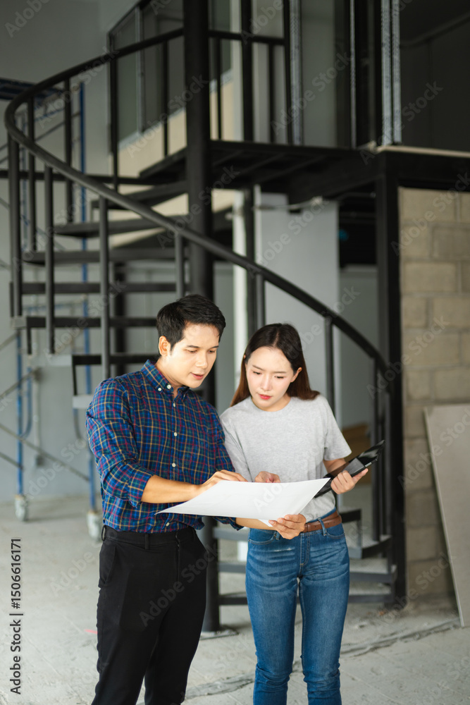Asian architects coordinating a construction plan while pointing and calling on site. Collaboration, modern planning, and project teamwork