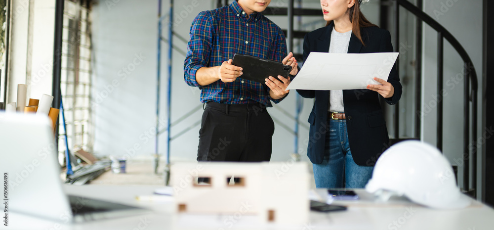 Asian architects discussing blueprints and house models during a site meeting. Indoor construction planning and teamwork concept.
