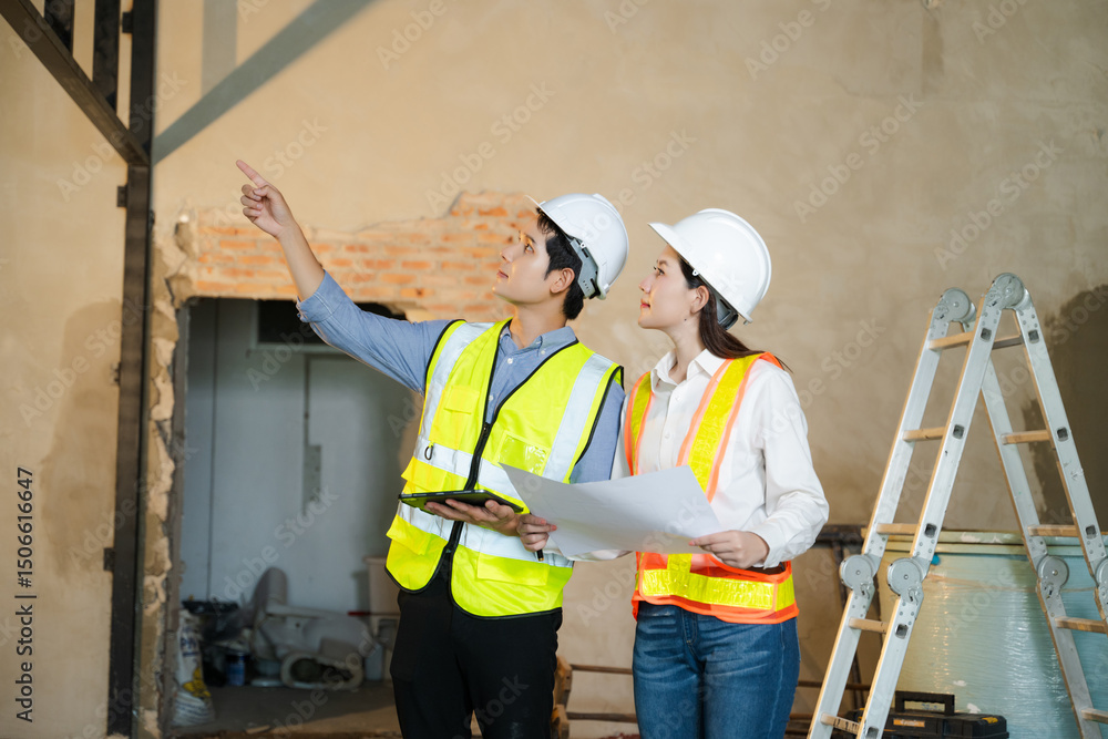 Asian architects and engineers planning construction project with blueprints, laptop, and teamwork in modern office site.