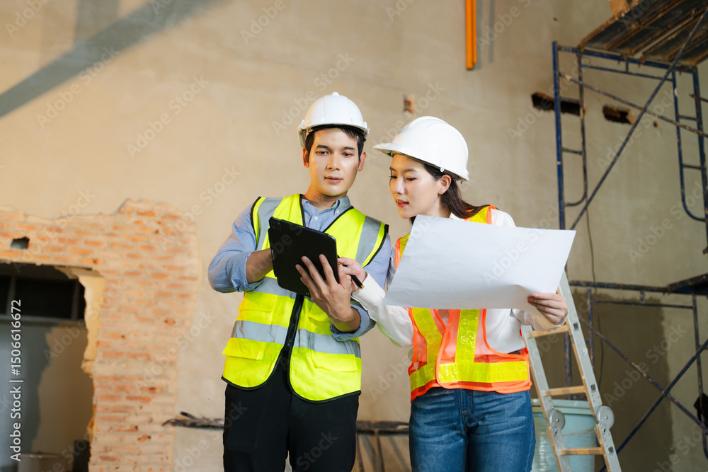 Asian architects and engineers planning construction project with blueprints, laptop, and teamwork in modern office site.