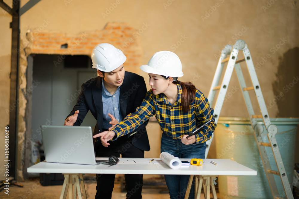Two architects at construction site discussing blueprints and models, using digital tools and wearing hard hats. Teamwork, planning,