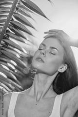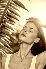 woman enjoying sunlight with closed eyes near tropical leaves, natural beauty, peaceful mood, summer vibes, clear skin glowing softly under bright sun