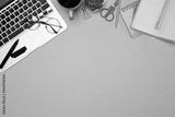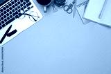 Creative workspace with laptop, glasses and office stationery on pastel blue background