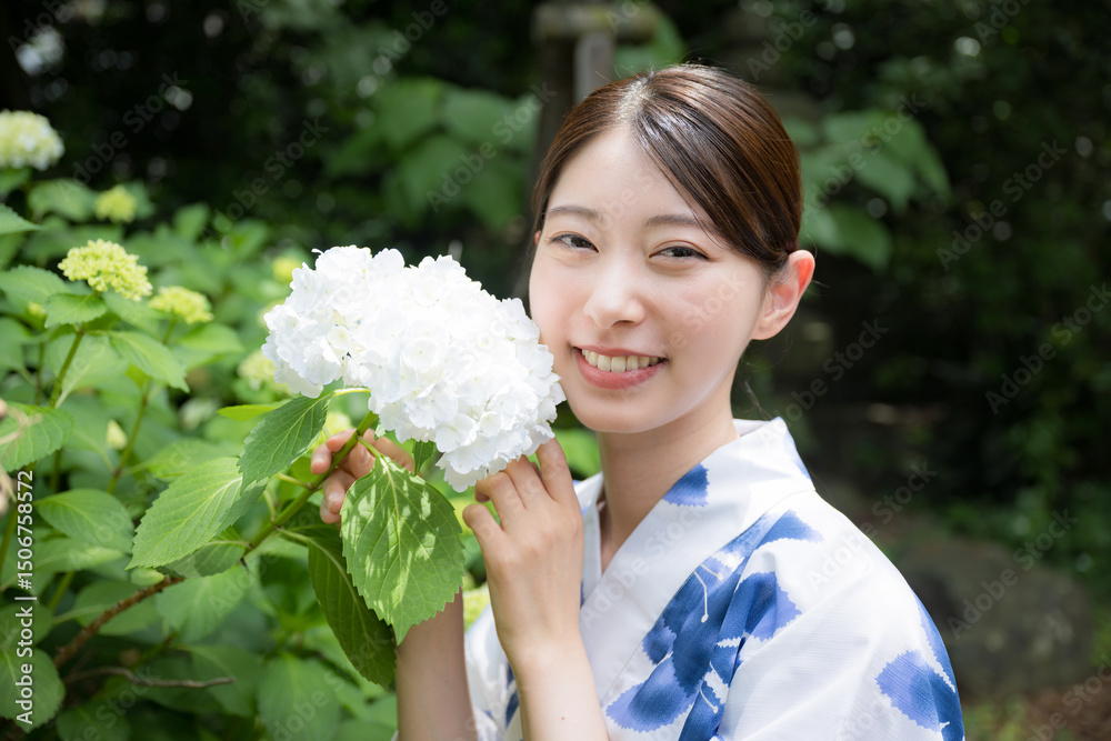 紫陽花と浴衣のかわいい女性のクローズアップ カメラ目線